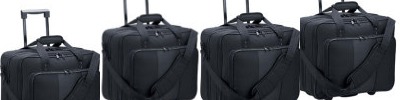 dimensions: 16" W x 8" D x 14" H; 100% polyester 600 denier coated canvas; 100% nylon taffeta lining; back compartment with a file separator and padded laptop storage; front compartments include elastic snap-clip straps; telescopic handle and in-line skate wheels; detachable adjustable shoulder strap;